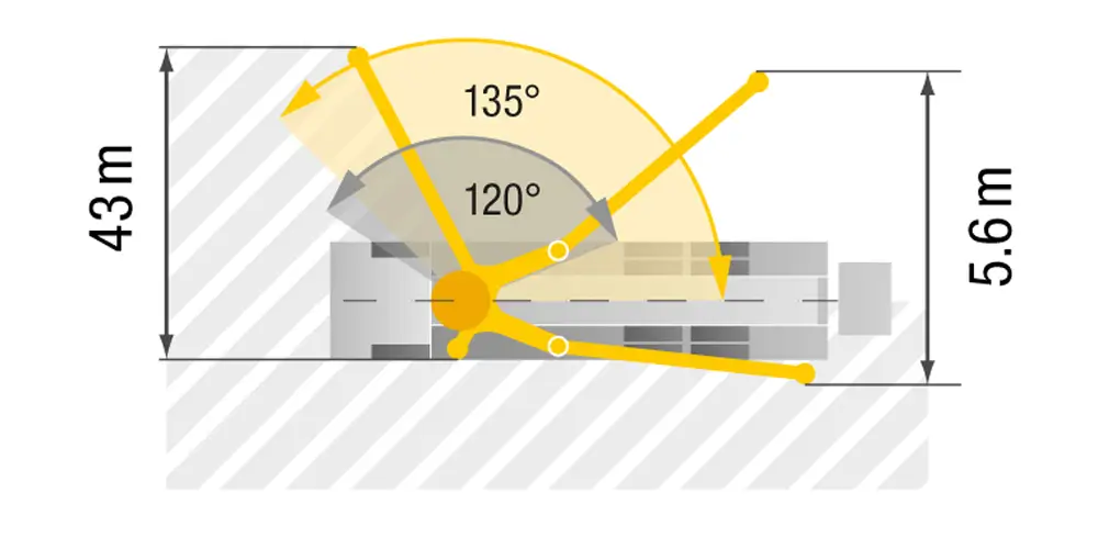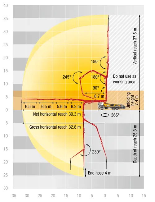 Selle masina vertikaalne ulatus on 37,5 meetrit, horisontaalne ulatus 32,8 meetrit (bruto) ja 30,3 meetrit (neto). Tänu madalale avanemiskõrgusele – vaid 7,4 m – on võimalik töötada isegi siseruumides ja madalate konstruktsioonide all.