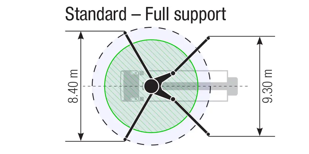 • Standard toestus: 8,4 m ees / 9,3 m taga