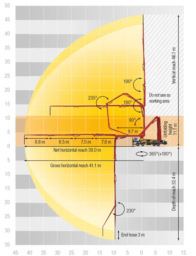 Tänu 5-osalisele Roll-Z poomile ulatub masin vertikaalselt 46,1 meetrini ja horisontaalselt 41,1 meetrini (bruto) / 38,0 meetrini (neto). Selle kompaktne avanemiskõrgus – vaid 11,1 m – teeb M47-5 ideaalseks tööriistaks nii kõrghoonete, sildade kui ka piiratud tööalade jaoks.