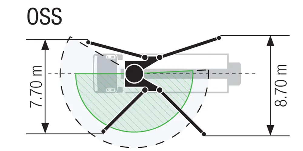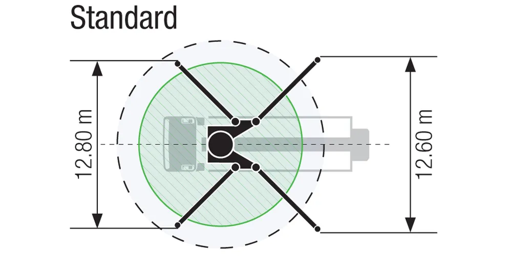 Tänu kolmele töörežiimile – Standard (12,4 / 12,2 m), OSS (7,5 / 8,3 m) ja iSC (2,6–12,4 m) – saab masinat kasutada ka kitsastes oludes.