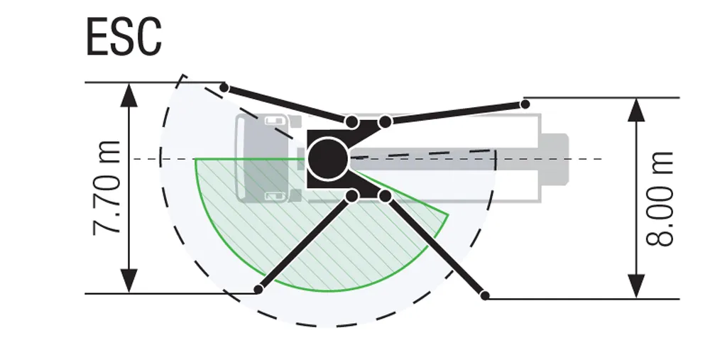 iSC (Intelligent Setup Control) süsteem arvutab automaatselt toestuse positsiooni ja ohutud tööpiirid, tagades maksimaalse stabiilsuse ka ühepoolse toestuse korral.