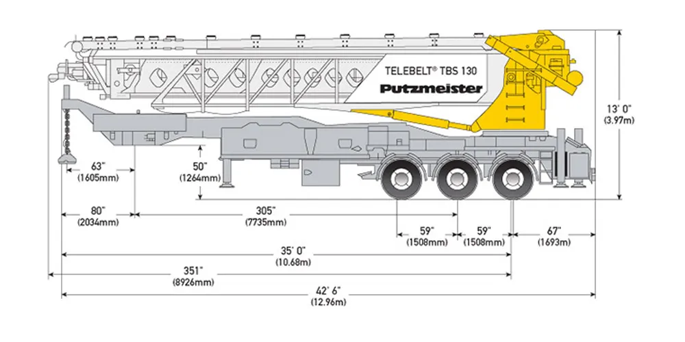 Putzmeister TBS 130 suudab paigaldada materjali kuni 38,47 m kaugusele ja üle 20 m kõrgusele, säilitades samal ajal kuni 275 m³/h läbilaskevõime – see tähendab, et Telebelt suudab täita terve rekka koorma vähem kui 10 minutiga. Tänu 360-kraadisele pöörlemisele ja 11,60-meetrisele feeder-lindile saab materjali paigaldada ükskõik millisest suunast, mis teeb masina kasutatavaks kitsastes töötingimustes, hallides ja tunnelites.